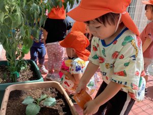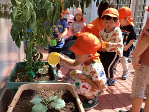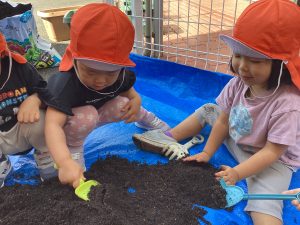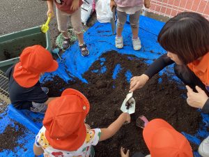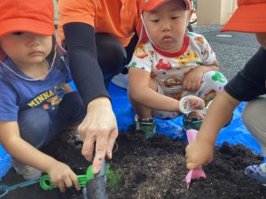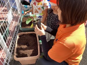 フカフカになった土に苗を植えました!ブロッコリーの苗を不思議そうに見ていました👀