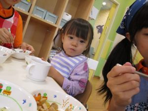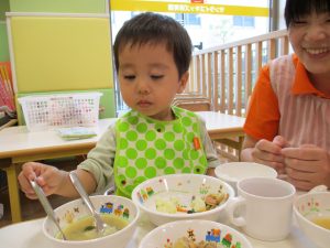 初めての集団生活に伴い早めのお迎えにご協力頂いていたご家庭のお子様達も今週より給食やお昼寝がスタートしました。