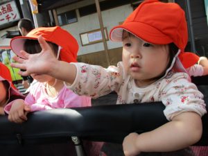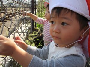 電車の迫力に圧倒されながらも「電車!電車!」と指をさしながら興奮気味に先生達に教える姿がとても可愛かったです。