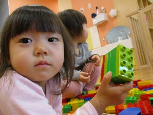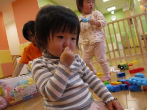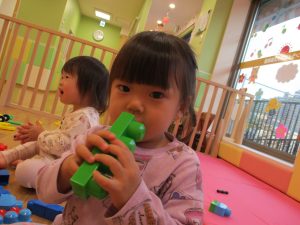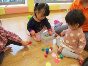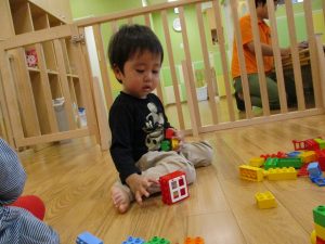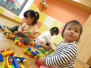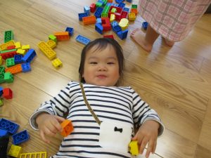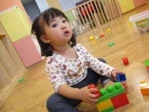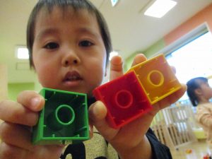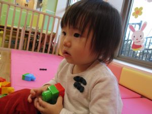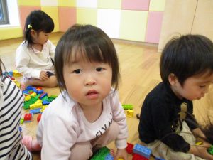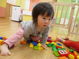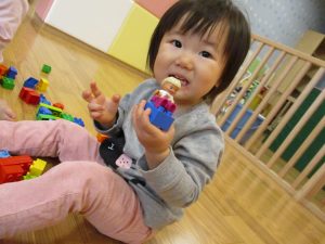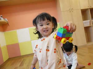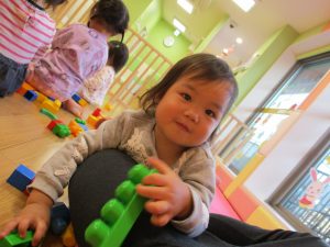 「おもちゃ何にするー?」と問いかけると皆が声を揃え「ブロックー」と言う程大人気のブロック遊び。