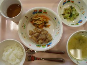 ご飯 味噌汁 鶏のから揚げ スパゲティソテー野菜 おかか和え