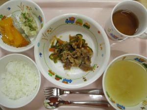 本日の給食になります。 ご飯 味噌汁 豚肉のみそ焼き スパゲティソテー野菜 みかん缶