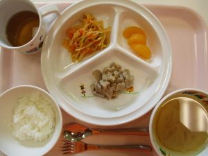 本日の給食になります。 ご飯 味噌汁 ツナポテサラダ 豚肉のケチャップソースからめ みかん
