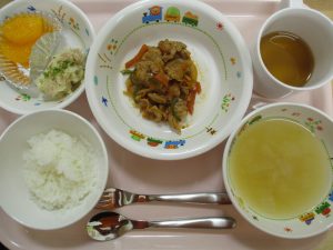 ご飯 味噌汁 ツナポテサラダ 豚肉のケチャップソースからめ みかん