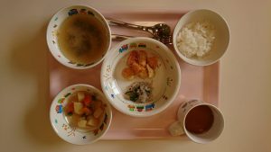 ご飯 味噌汁 じゃがいも揚げ きゅうりともやしのゆかり和え 含め煮