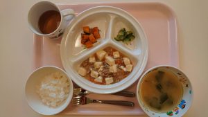 ご飯  味噌汁 麻婆豆腐  かぼちゃの素揚げ  梅和え