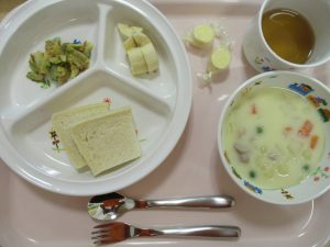 本日の給食になります。 食パン チキンクリームシチュー 混ぜ混ぜサラダ チーズ バナナ