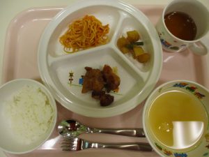 ご飯 味噌汁 鶏肉のママレード焼き スパゲティソテー 含め煮