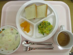 食パン クリームシチュー キャベツの味噌ドレサラダ みかん缶