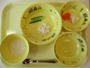本日の給食になります。 離乳食中期→胡瓜はさらに刻みました 離乳食初期 ご飯 味噌汁 魚の西京焼き ...