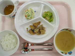 ご飯 味噌汁 魚のから揚げ ポテトサラダ おかか和え