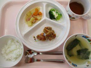 ご飯 味噌汁 照り焼きチキン ベーコンと野菜の煮物 ブロッコリー塩茹で