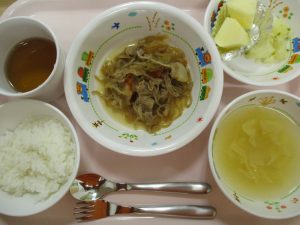 ご飯 味噌汁 すき焼き風煮 粉ふき芋 りんご