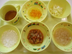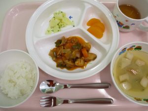 ご飯 味噌汁 チキンと野菜のケチャップ煮込み 粉ふき芋 オレンジ