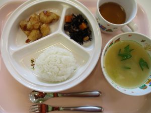 ご飯 味噌汁 魚のフライ ひじきの炒り煮