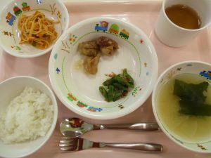 ご飯 味噌汁 鶏のさっぱり煮 ツナ入りスパゲティソテー おかか和え