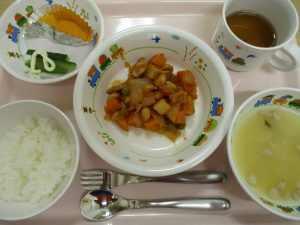 ご飯 味噌汁 ポークビーンズ スティックきゅうり みかん缶