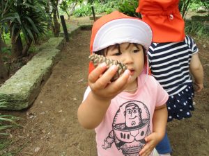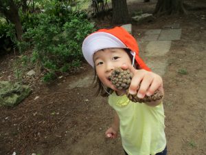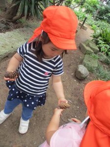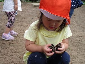年間を通して松ぼっくりが拾える為、子ども達は「まーぼっくり」と言い懸命に探して、自分のお気に入りの松ぼっくりを見つけて嬉しそうにする姿がとても可愛らしいです♪