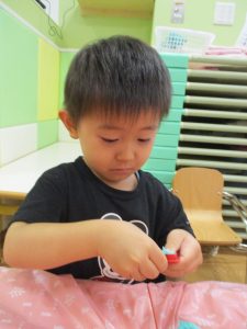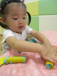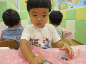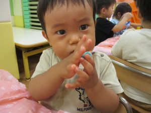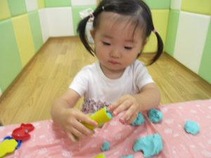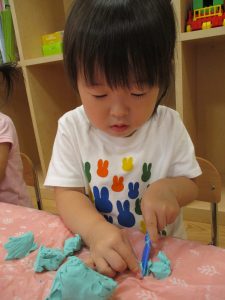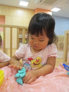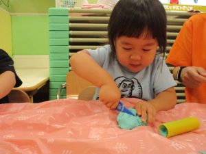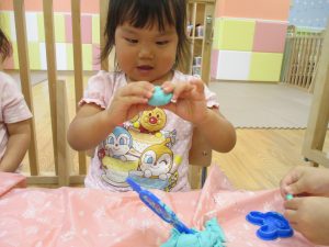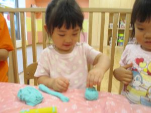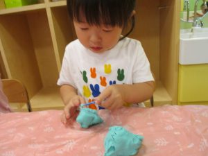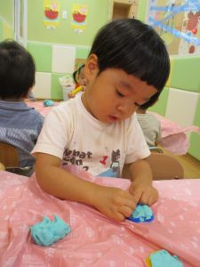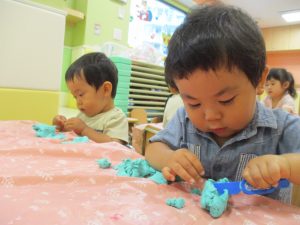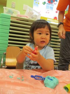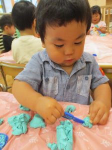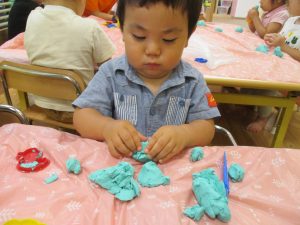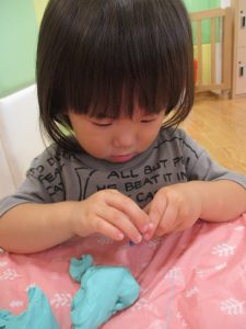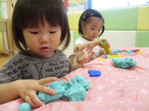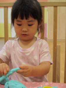 飽きてしまった子の為に隣の保育室では体を動かして遊べるような環境を用意しておりましたが、この日は集中して粘土遊びを行っていました。