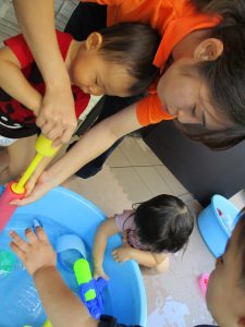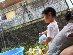先週は水がかかると「えっ?かけるの?」と言わんばかりの表情をしていた子も今週は、自分で体に水をかけ満面の笑みを浮かべており数日で成長していく谷津園の小さな太陽達の可愛さに癒されております。