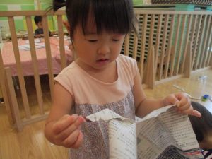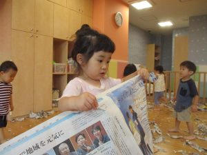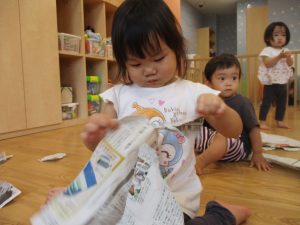 新聞紙遊びを横目に塗り絵や絵本を楽しむ子ども達がいて、そこにもしっかりと関わる先生がいる事でとても素敵な保育となりました!