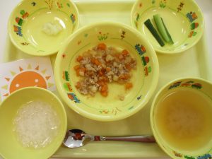 粥 味噌汁 そぼろ煮 スティックきゅうり りんご