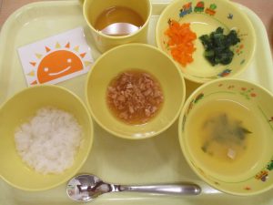 粥 味噌汁 煮魚 ゆでにんじん きざみお浸し