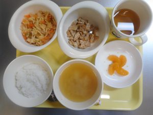 粥 味噌汁 そぼろ煮 スティックきゅうり みかん缶