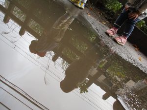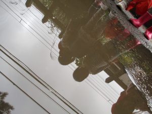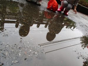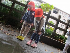 雨上がりの水たまりが気になるようで葉っぱを浮かべて「船だよ」と言いながら楽しんでいました。