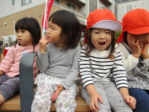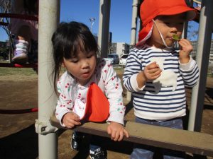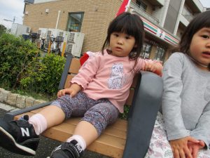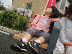 保育園に戻る途中コンビニ前のベンチで一休み。