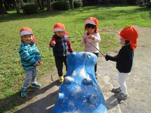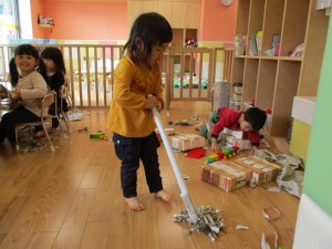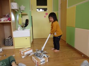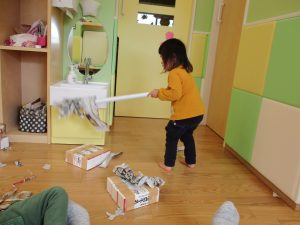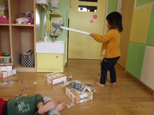 先生が新聞紙で本格的な掃除道具を作ってくれ子ども達は終始夢中で遊んでいました!