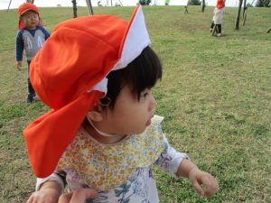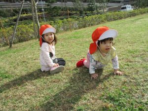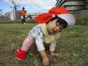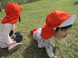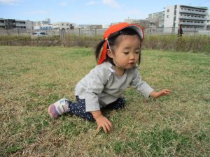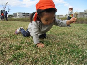 ハイハイやゴロゴロと転がり芝生の感触を存分に味わう子もいました。