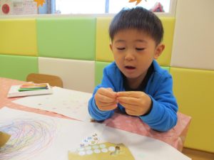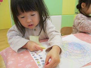 いつも以上に真剣な表情でシール貼りを楽しんでいました。