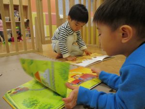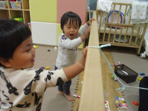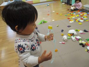0歳児のお友達も先生に見守られながら少しずつ遊べるようになってきました♪