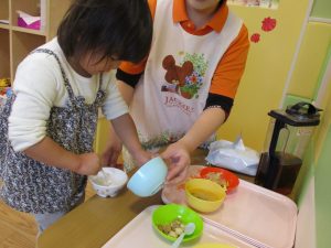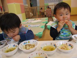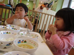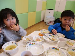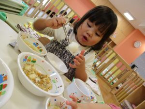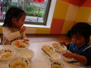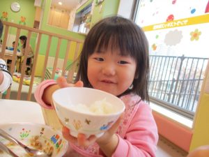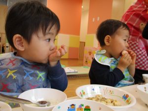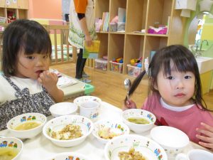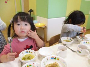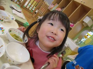おかずの「ベーコンポテトチーズのせ」にとても興味があったようで「これ何?」と先生にたくさん質問していました!