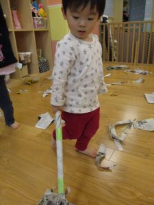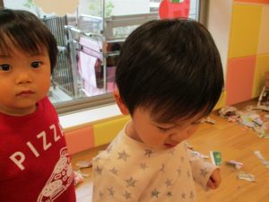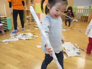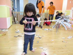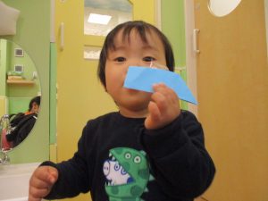 契ったり丸めたり、くしゃくしゃにしてみたり、ぞうきんに見立てたりと、思いおもいの遊び方を楽しんでいました!
