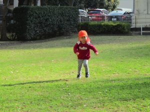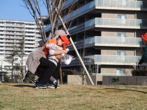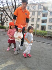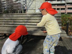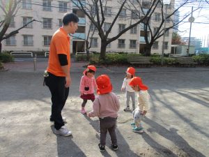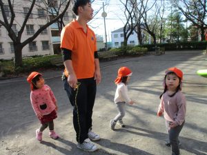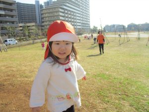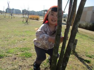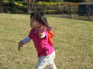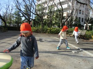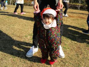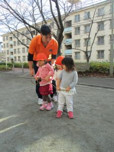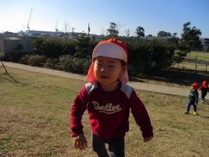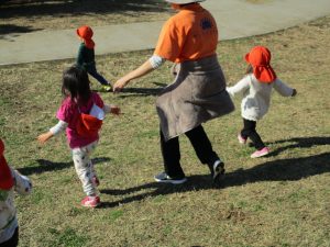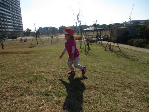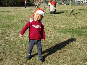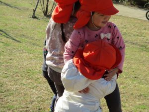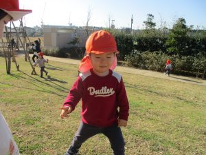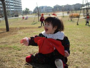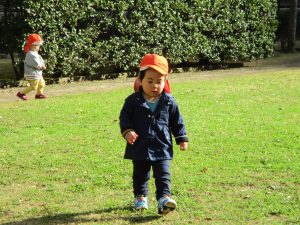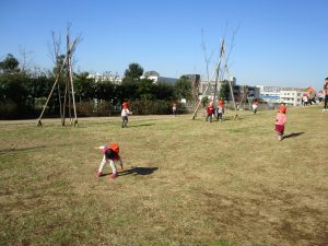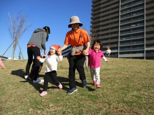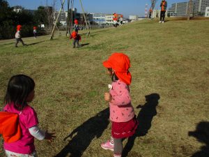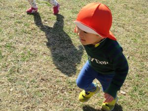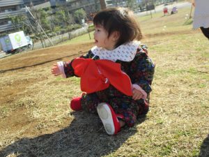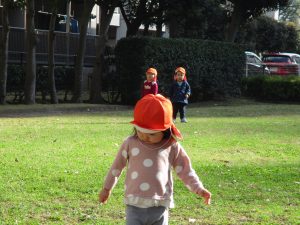 思いのほか気温も上がりポカポカ陽気の中、芝生の感触を味わいながら戸外遊びを楽しみました。