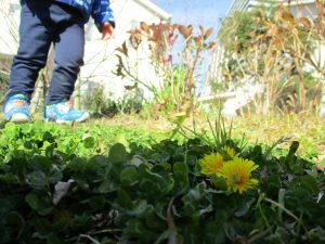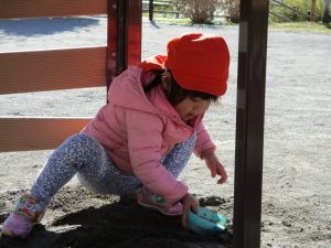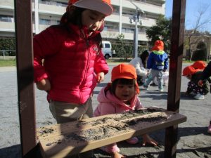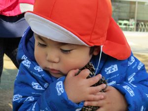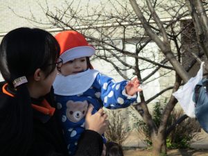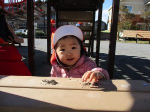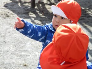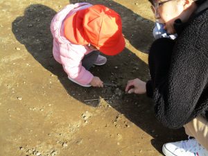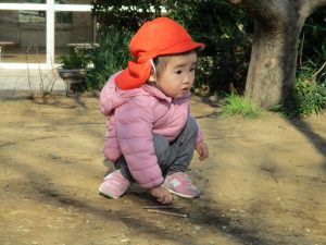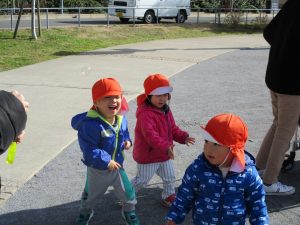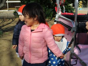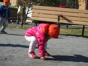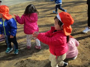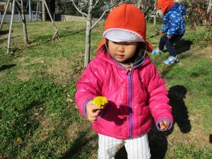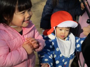 2歳児さんが0歳児さんと手を繋ごうとしたり、自然物を渡そうとしたり異年齢の交流も良く見られました。