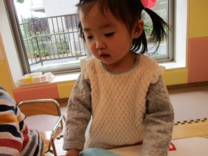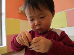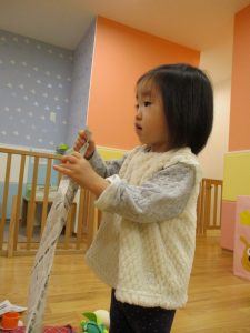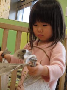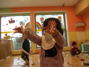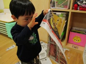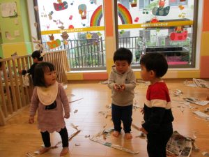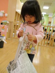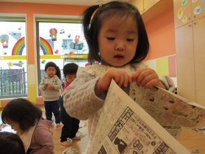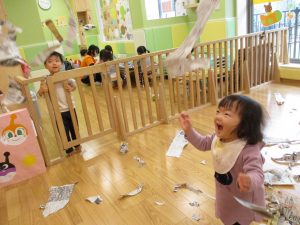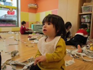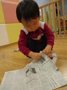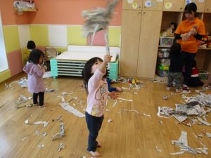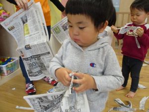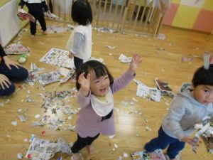 久しぶりに新聞紙遊びを行いましたがビリビリと破れる音が楽しいようで何度も何度も繰り返していました♪