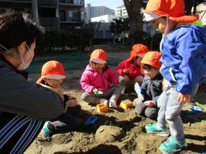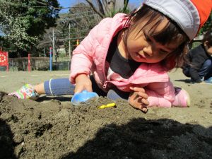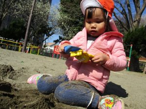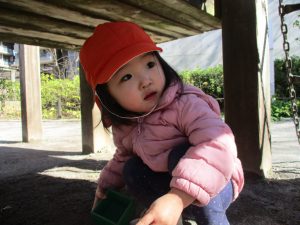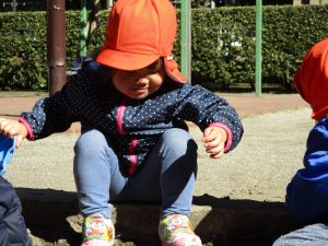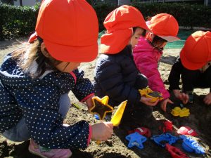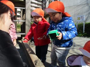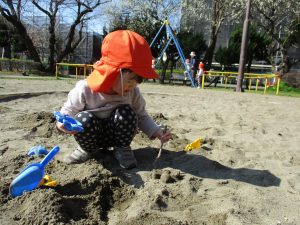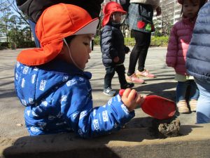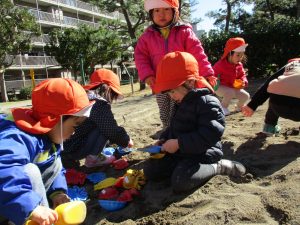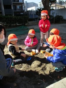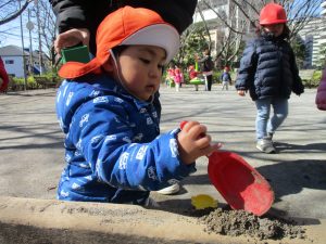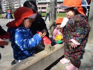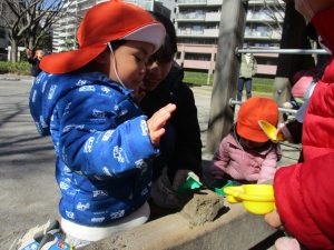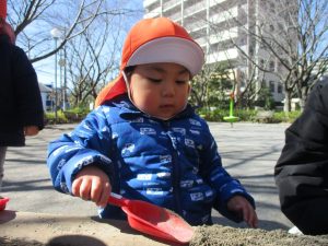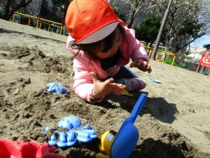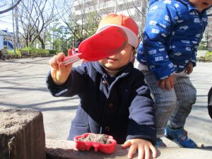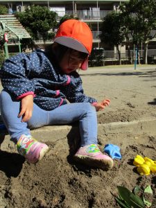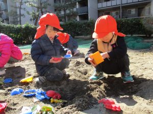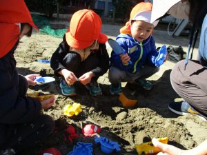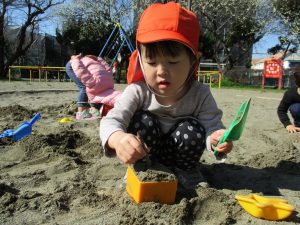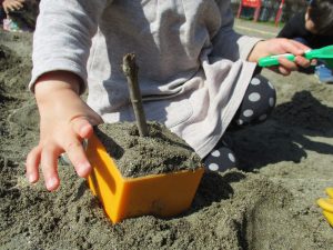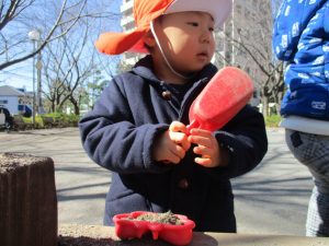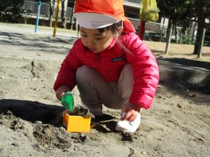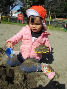 この日はままごと遊びに夢中で型入れに楽しそうに砂をたくさん入れていました♪