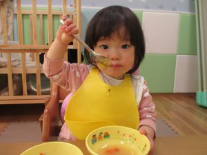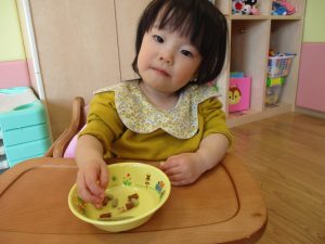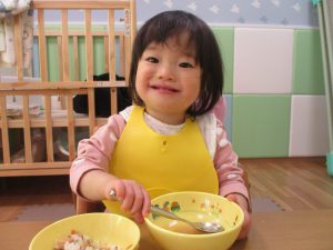 1歳児さんも「ご飯出来ましたよ」とお店屋さんになり切っていました。