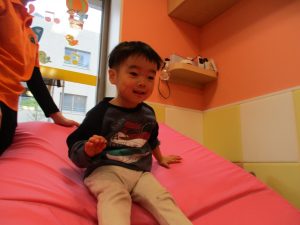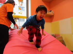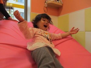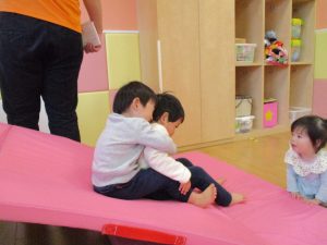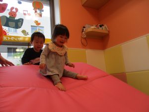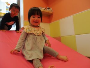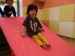 コットやマットを組み合わせてお手製の滑り台を設定しましたが、ダイナミックに遊べました♪