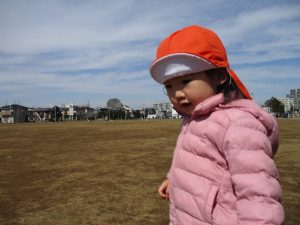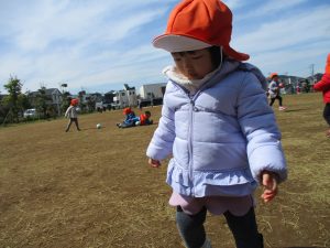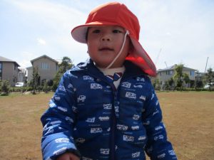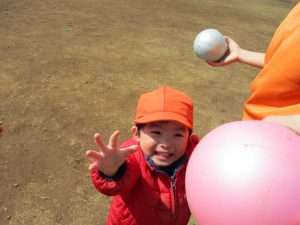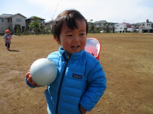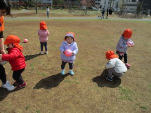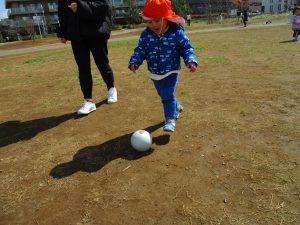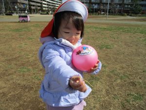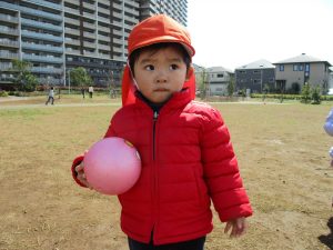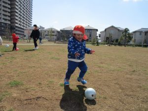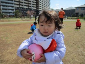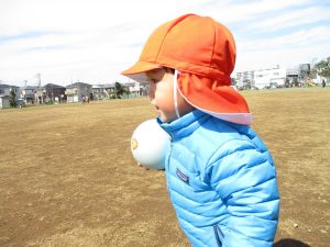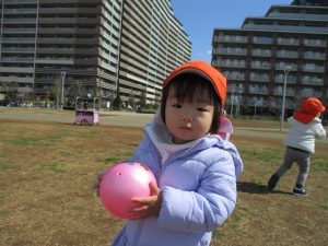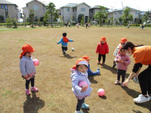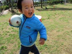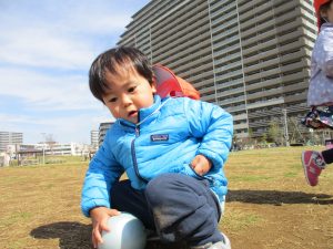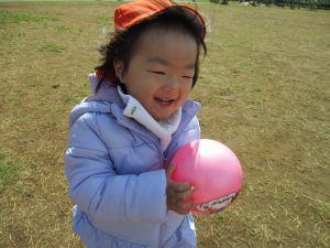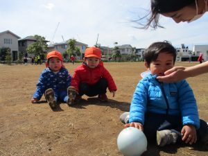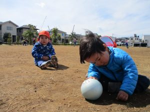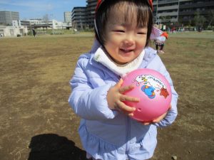 0,1歳児のお友達は防災公園の広場にてボールを使ってたくさん体を動かして遊びました。