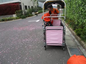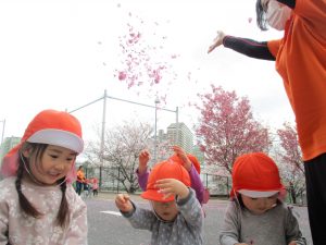 2歳児の卒園を祝うがごとく桜吹雪がここ数日やみません!