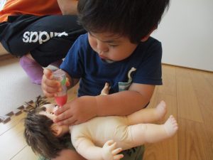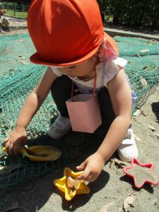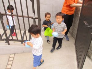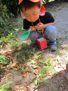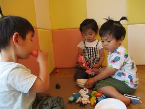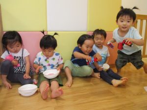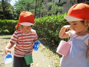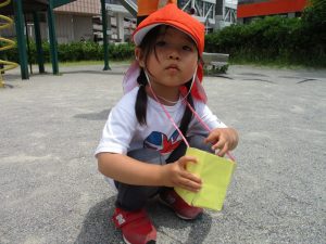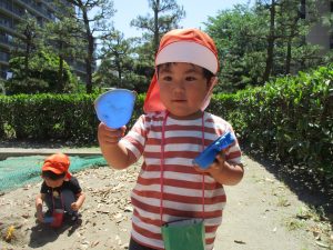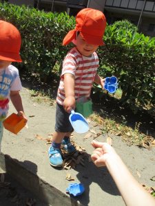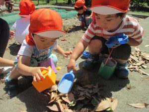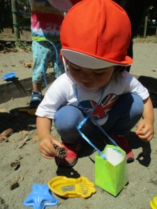 2歳児さんは暑さに負けず1号公園にてままごと遊びを楽しみました!