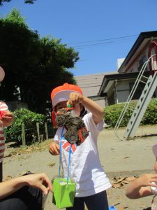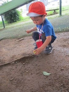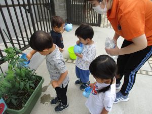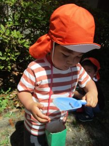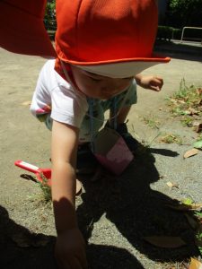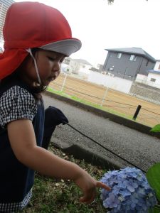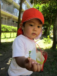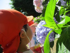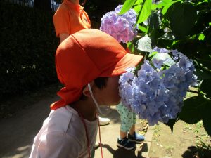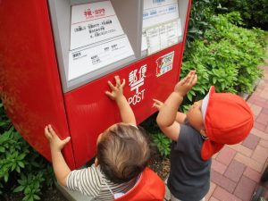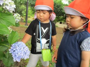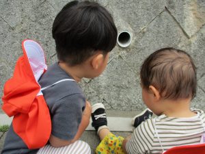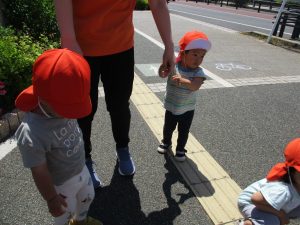 梅雨入りしたはずなのですがまさかの快晴で気温が予想以上に上がり短い時間のお散歩となりましたが、郵便ポストや排水口など園周辺の何気ない発見を楽しんでいました。