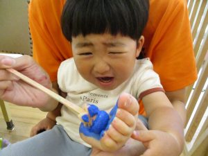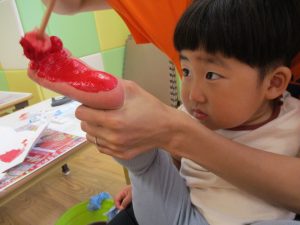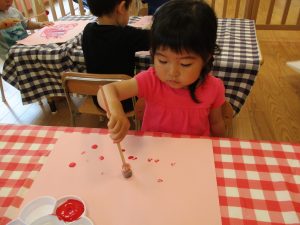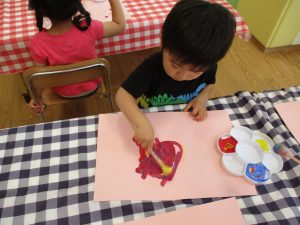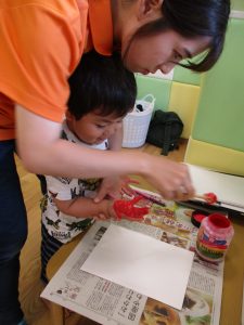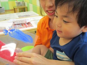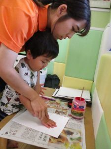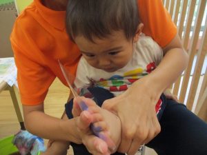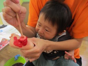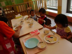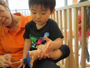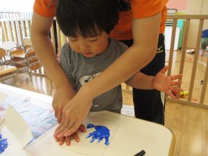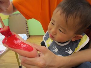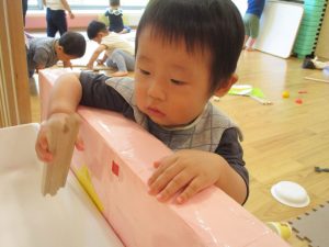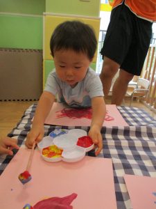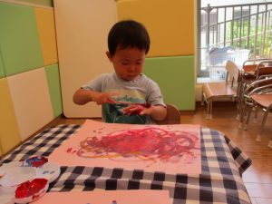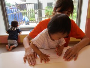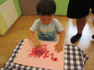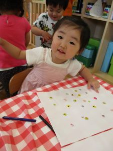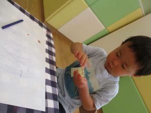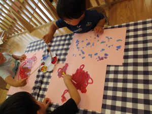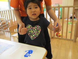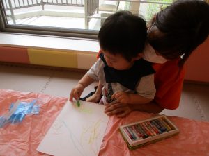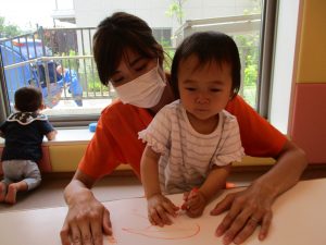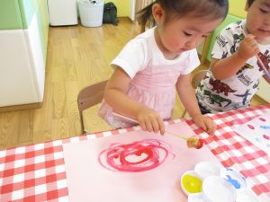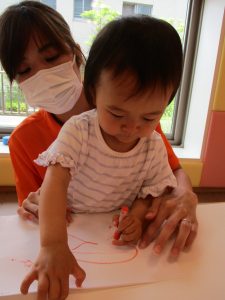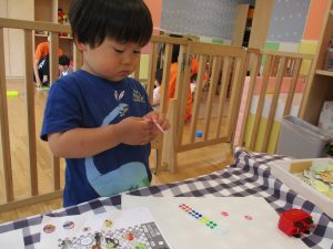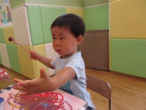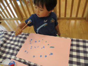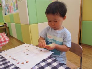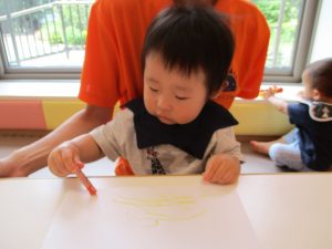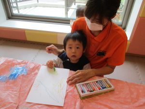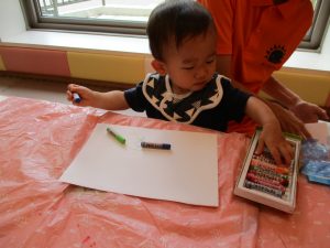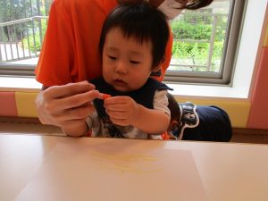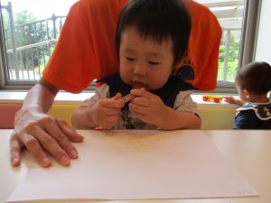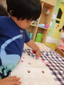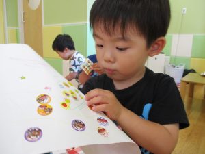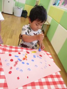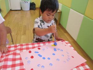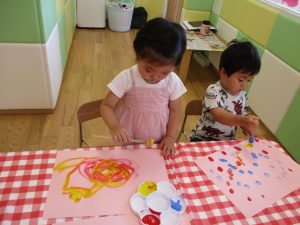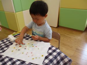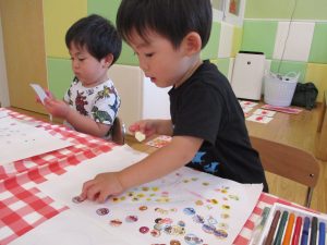 2歳児さんはクレヨン、絵の具スタンプ、シール貼りの机上遊びを中心に楽しく過ごしました。