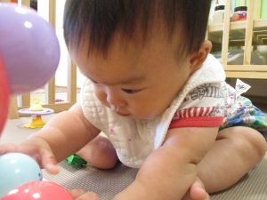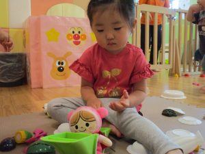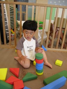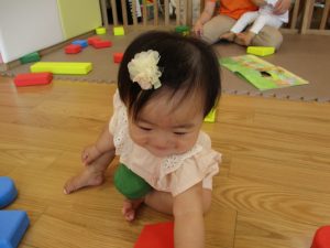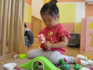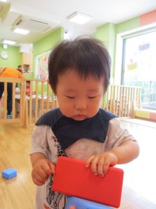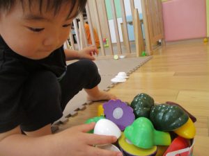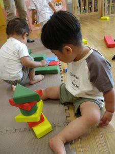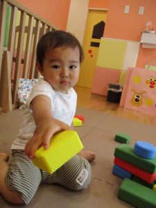 0.1歳児さんはソフト積木やままごとで遊びました。