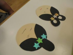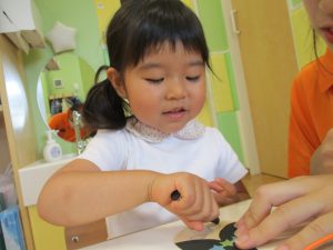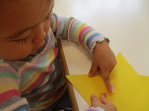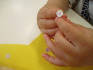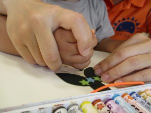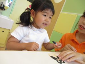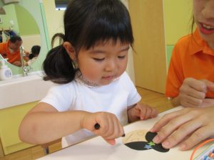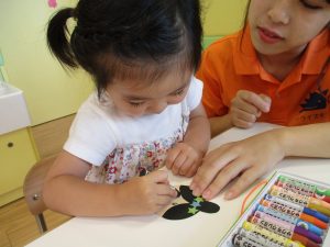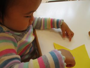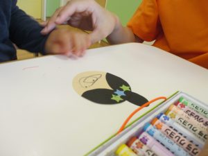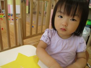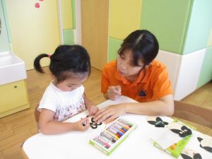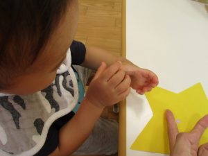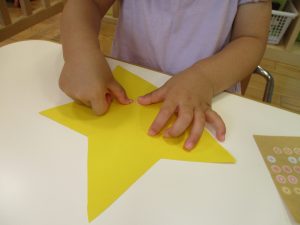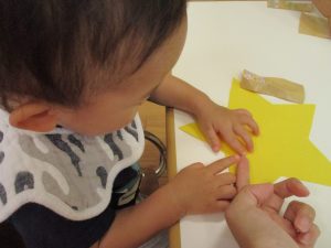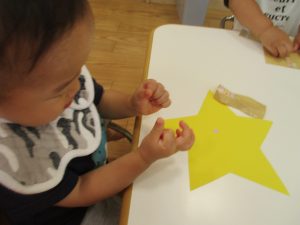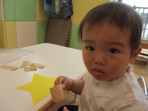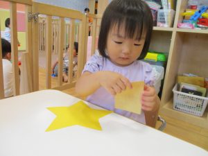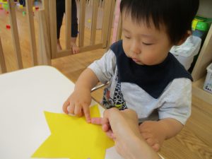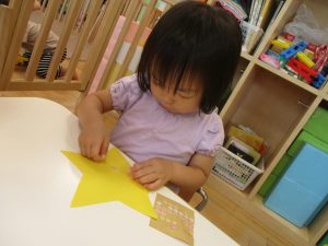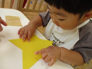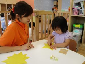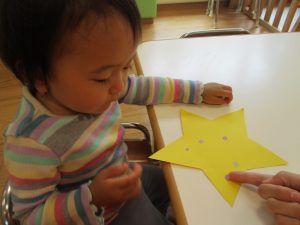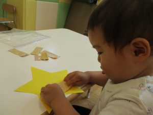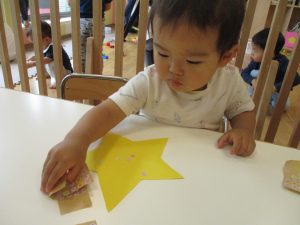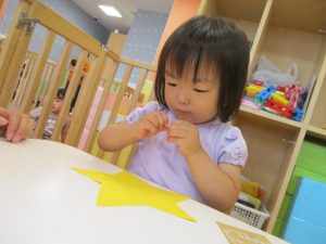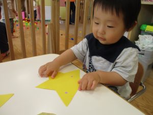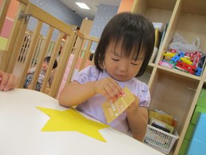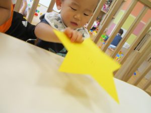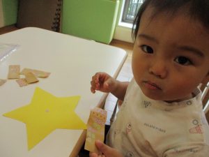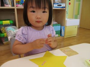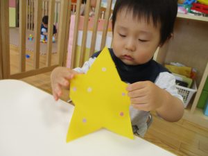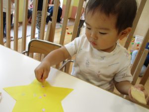 2歳児さんは織姫と彦星の顔をクレヨンで描き、1歳児さんは星のマークに好きなシールを貼って仕上げました♪