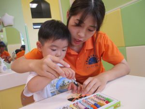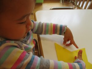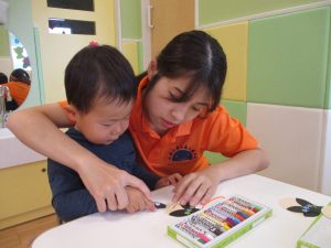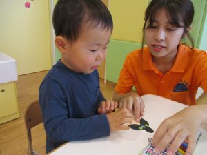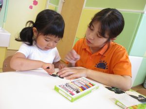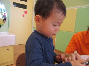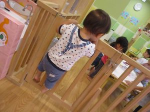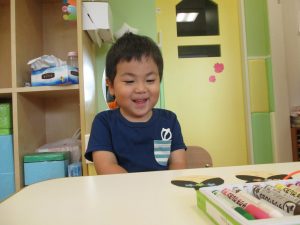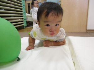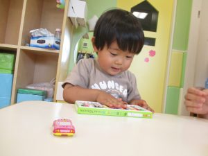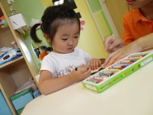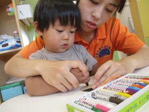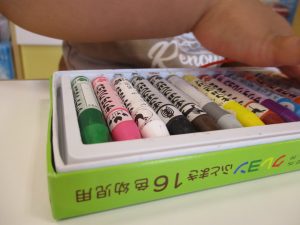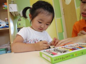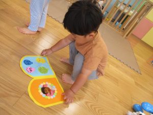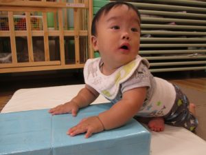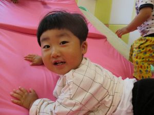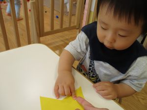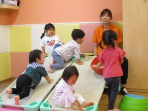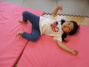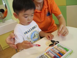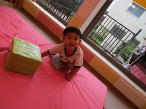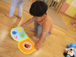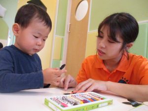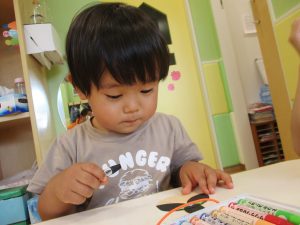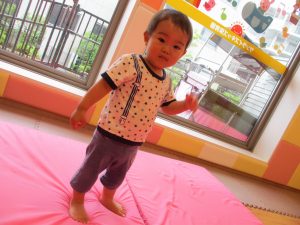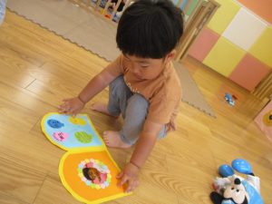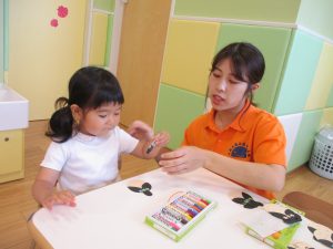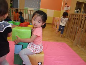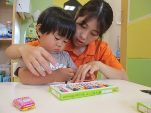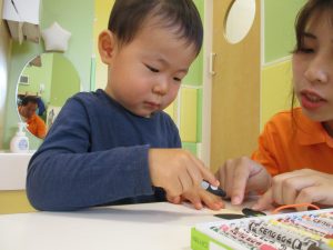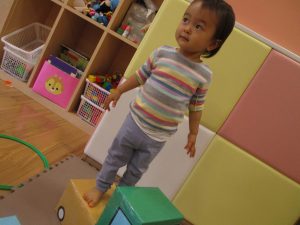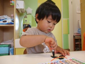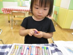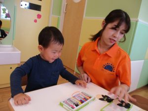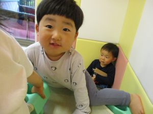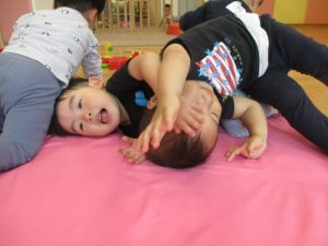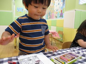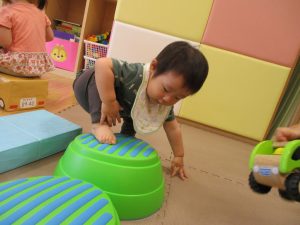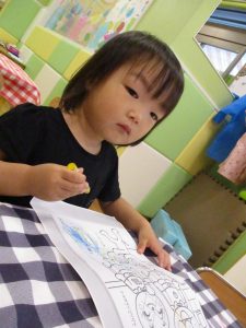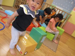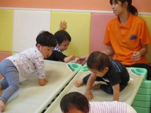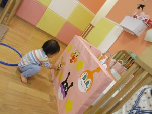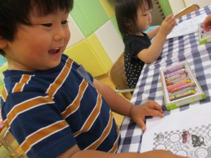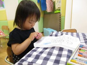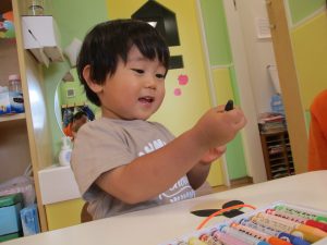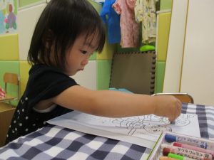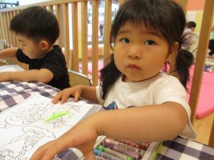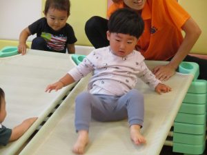 クレヨン塗り絵で机上遊びを楽しんだり、コットとマットで簡単なすべり台を通して思い切り体を動かして遊びました!